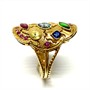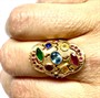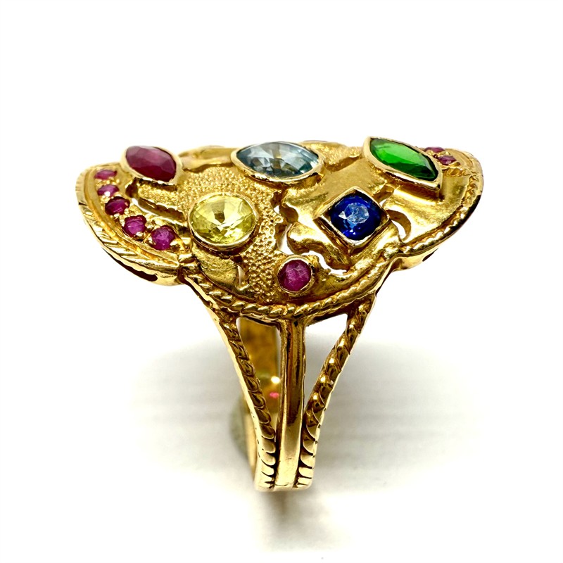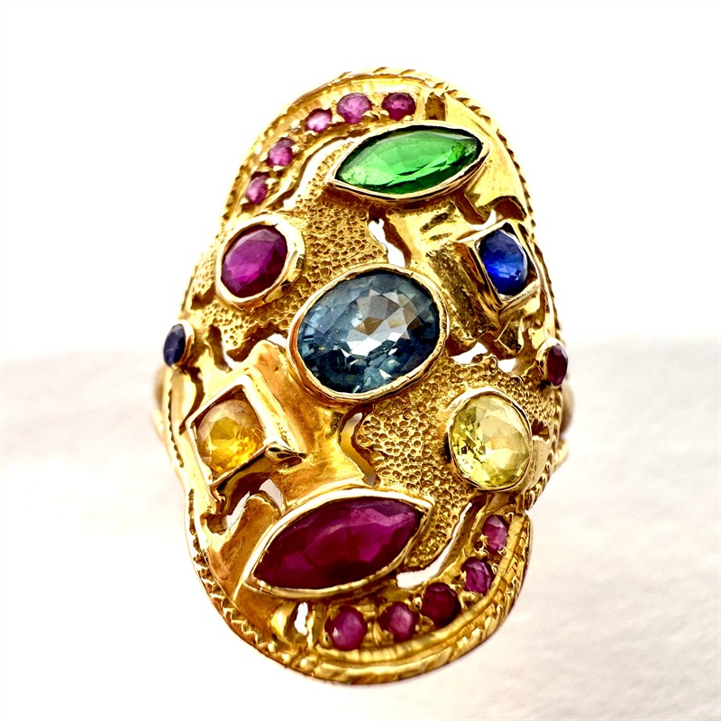 Nevšední prsten z 18ti karátového zlata (750/1000) zdobený drahými kameny. Jedná se rubíny, safíry, citríny a turmalín. Drahé kameny jsou přírodního původu. Celková váha prstenu 4,20 g. Velikost 53. Ojedinělý, velmi příjemně nositelný šperk vynikající vysokou kvalitou užitých materiálů i zpracování v perfektním stavu.