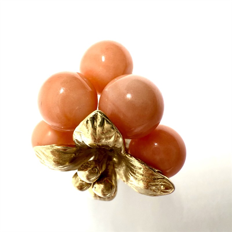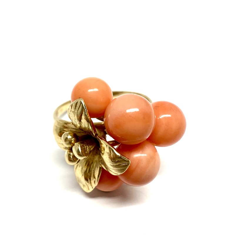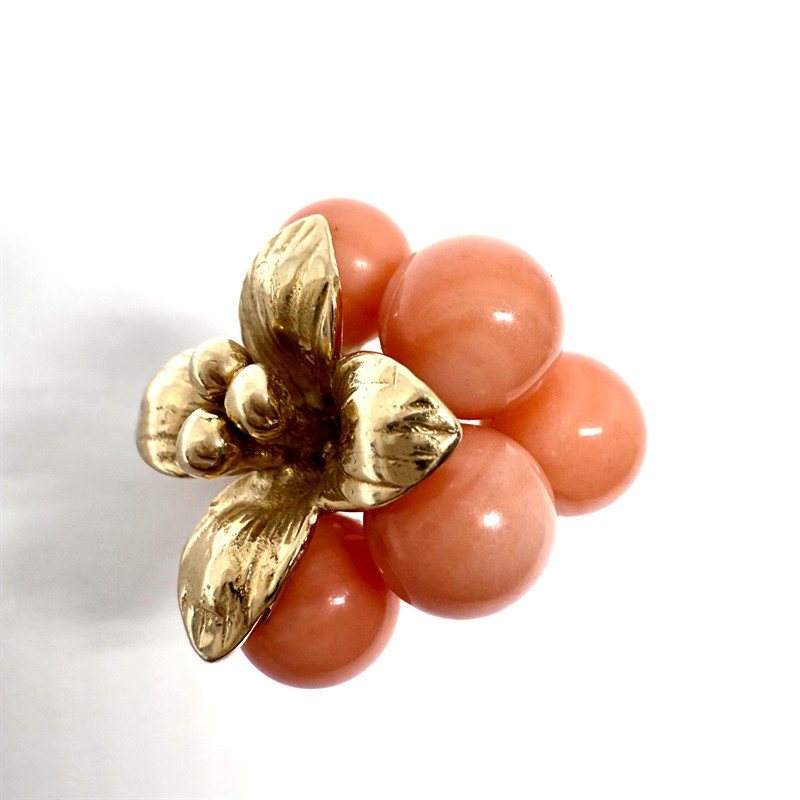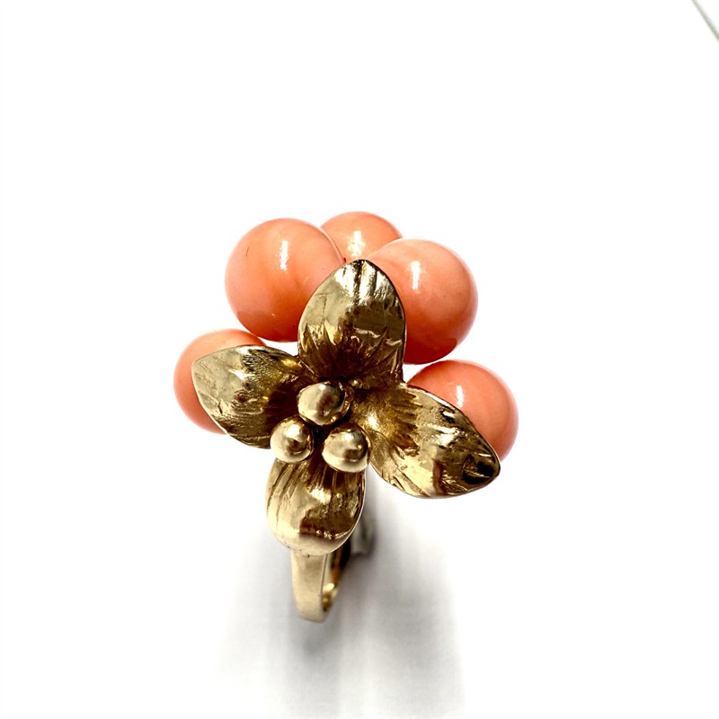 Originální, půvabný zlatý prsten. Šperk byl zhotoven ze 14ti karátového zlata a zdobí jej 5 lososových korálů, seskupených do tvaru hroznu a zlatý květ. Celková váha 5,07 g. Velikost 54. Prsten byl profesionálně vyčišěn a je v perfktním stavu.