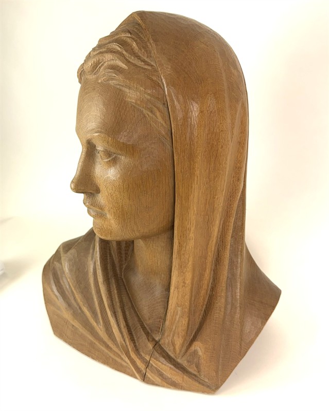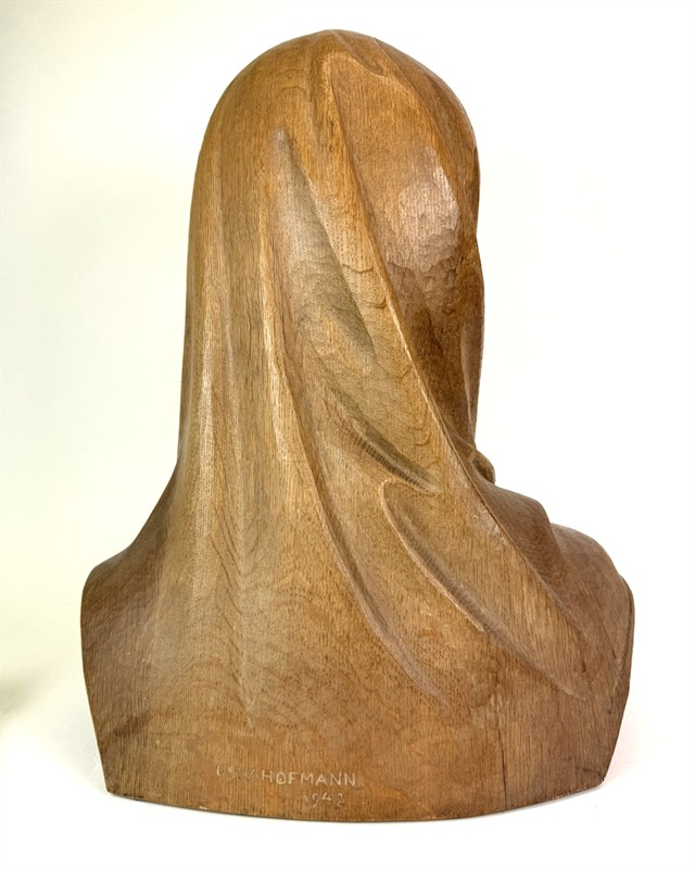 Akademický sochař Oswald Hofmann, pocházel z Kovářské v Krušných horách a vyrůstal v rolnickém prostředí, kde získal první zkušenosti u místního řezbáře. Po první světové válce začal roku 1919 studovat na Akademii v Mnichově, kde se natrvalo usadil. Udržoval však kontakty s českým prostředím a vystavoval se skupinami Junge Kunst a Prager Secession. Představená busta zobrazuje ženu s šátkem jako matku, která vyhlíží návrat svého syna z války. Lipové dřevo. Výška 49 cm. Signatura a datace na zadní části busty.