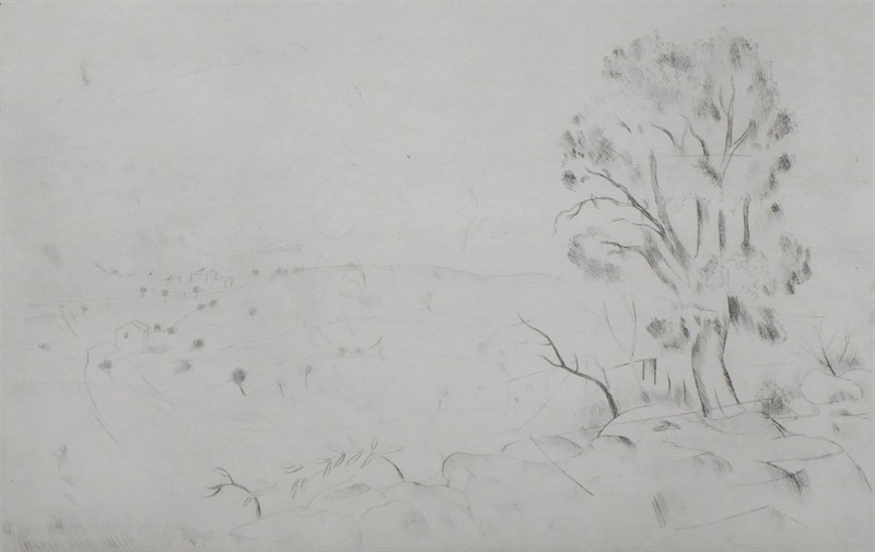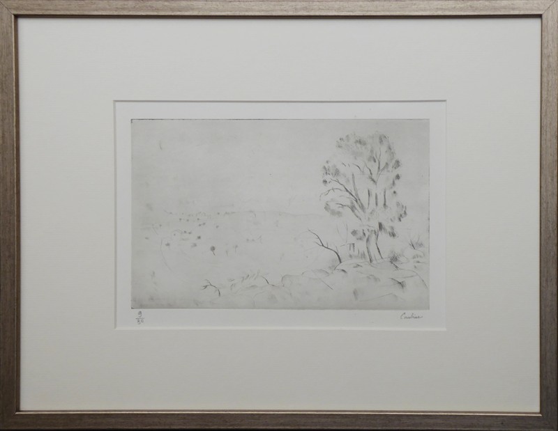 Lept a suchá jehla na papíru 15 cm x 24,5 cm. Signováno vpravo dole Coubine. Vlevo dole číslo listu 9/30. Scenérie zachycující krajinu s osamělým stromem ve francouzském regionu Provence. Ve stříbrném rámu s paspartou a sklem. Francie, Provence 1924 - 1925. Celkový rozměr s rámem 34 cm x 45,5 cm.