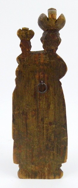 Dřevořezba. Přiloženo osvědčení Národního památkového ústavu České republiky. Dřevořezba špalíčkového typu Panny Marie Svatohorské s malým Ježíškem v náručí respektující všechny ustálené kompoziční znaky. Oba jsou korunováni. Madona stojí na nízkém trojúhelníkovém podstavci s čelní hranou v ose řezby. Zadní strana plochá. Téměř zcela setřelá polychromie propůjčuje této dřevořezbě velmi zajímavou patinu. Čechy, třetí třetina 19. století. Výška 22 cm.