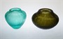 Pár masivních váziček v líbivých barevných odstínech skla Beryl a Topas. Ateliérové sklo zušlechtěné hluboce leptaným dekorem s abstraktním ornamentem od sklářského výtvarníka, brusiče a rytce Antonína DROBNÍKA (*1925 +2007). Provedení Jablonecké sklárny závod Železnobrodské sklo - ŽBS. Dobrý stav, rozměr - v. 11cm, prům. 12cm a v. 11cm, prům. 15cm