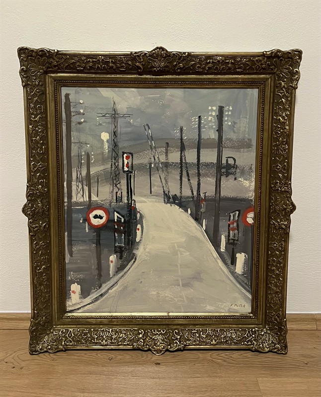 F. Pašek (*1922) - Železniční přejezd, kombinovaná technika, rozměr 50 x 60 cm (65 x 75), rámováno v krásném slohovém rámu, signováno. Akademický výtvarník, sochař a restaurátor, studia na VŠUP u profesorů Otto Eckerta a Jana Kavana. Řada jeho děl byla realizována v architektuře - Kalich metro Želivského, Čápi park u České televize, dále barokní faksimile metro Malostranská a pro zahradu zámku v Tróji. Věnoval se také tvorbě malířské, kde byl např. inspirován motivem městských a industriálních krajin s vystižením atmosféry výtvarného díla. Působil jako profesor na pražské Akademii a byl členem komise Mánesa.