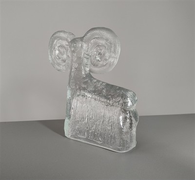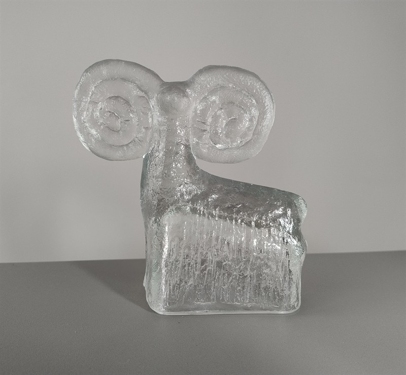 Jedna z trojice slavných postaviček z lisovaného skla, které navrhl Pavel Pánek v 70. letech pro Sklárnu Rudolfova huť. Tento kousek z lisovaného čirého skla (vzor 13290, výška 13,5 cm, rok 1971) představuje berana v typickém stylu českého designu té doby jednoduché, ale působivé linie a hravý charakter. Stav: Bez poškození Krásný sběratelský objekt pro milovníky českého uměleckého skla a retro designu 70. let.