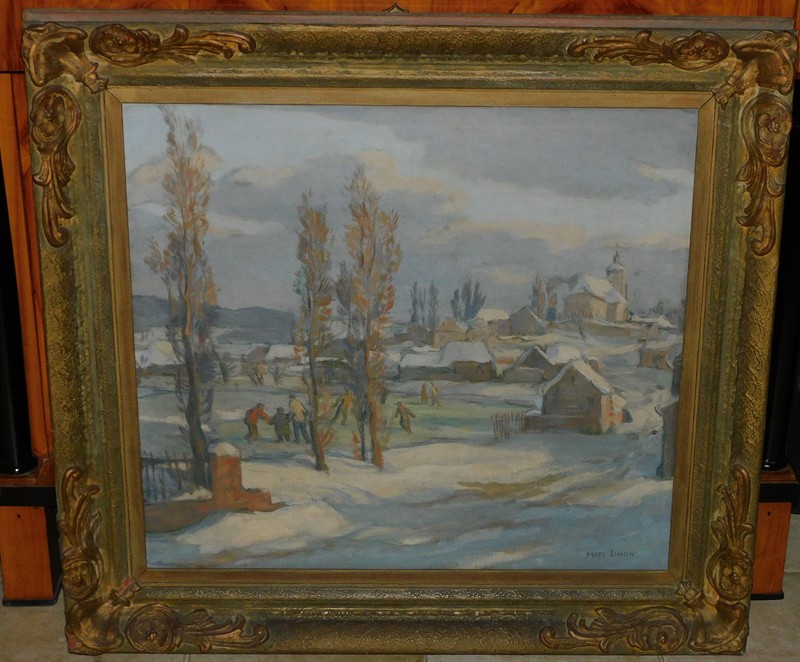 Olejomalba na plátně, velikost 60 x 70 cm, s rámem 80 x 90 cm. Signováno vpravo dole. Původní krásný rám francouzského typu. Pavel Šimon (1920-1958), český malíř, syn profesora T.F. Šimona, studia na AVU v Praze u Pukla, T. F. Šimona a Pelce. Galerijní formát, perfektní stav. Vánoční nálada s koledníky !!