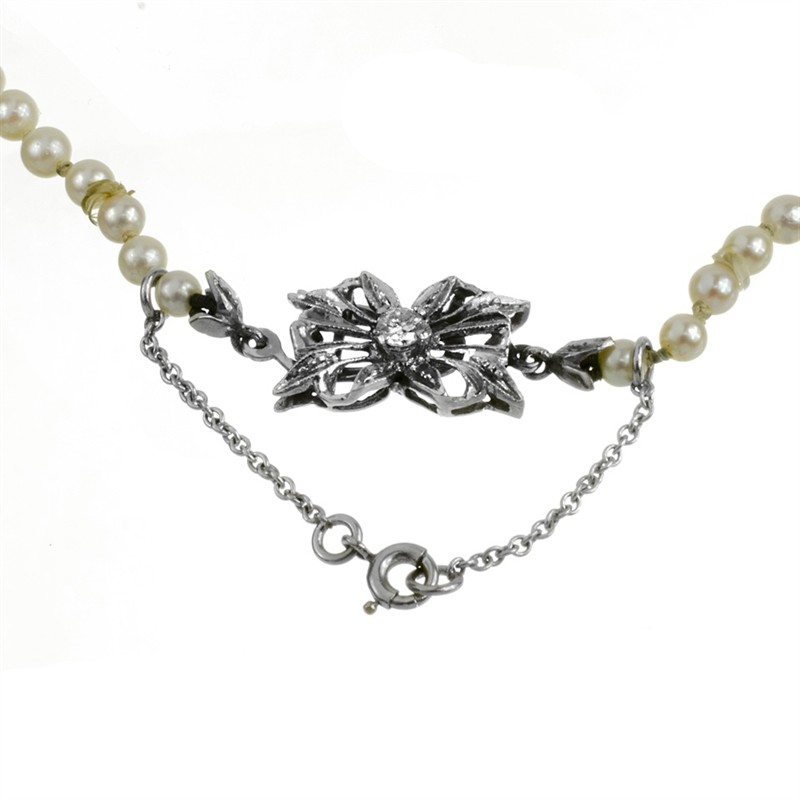 Perlová šňůra s uzávěrem z bílého zlata zdobeným brilianty. Au 750/1000, 15,48g, brilianty 0,12 ct. Čechy, 30. léta 20. století.