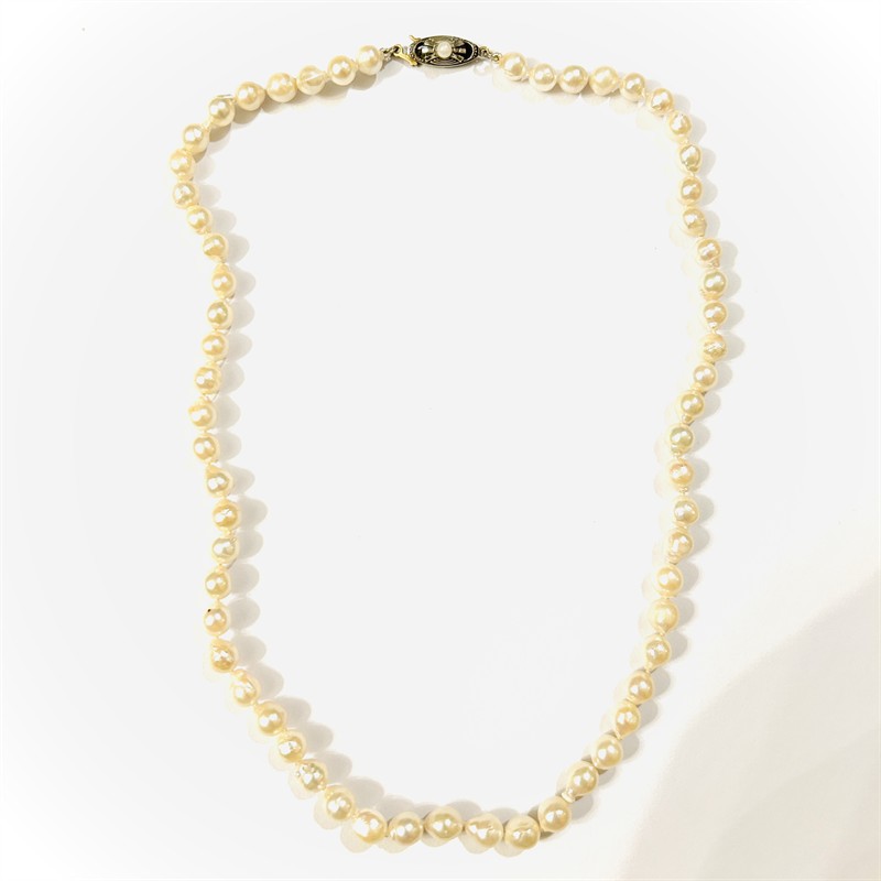 Velice elegantní náhrdelník se šňůry přírodních kultivovaných smetanově bílých perel, ty vynikají svým nedokonale kulatým organickým tvarem a průměrem okolo 6 mm. Oválné art-deco prolamované zapínání osazeno přírodní bílou perlou, frontální část z bílého, spodní ze žlutého zlata. Vkusný, tradiční šperk vhodný k dennímu nošení i večerní příležitosti, německá práce pforzheimského výrobce J. Köhle z 2. třetiny 20. století. Koncové kroužky zhotoveny ze 14 karátového zlata, tj. o ryzosti 585/1000, zapínání z 8 karátového, tj. o ryzosti 333/1000; nově opatřeno punc Z-59 (písmeno Z s alchymistickou růží) na háčku, ryzostní číslo a značka výrobce "JKa" zespoda zapínání. Hmotnost 21,60 g, délka 46 cm, zapínání 15 mm. Nově převlečeno, perly jsou mezi sebou pečlivě uzlíkovány. Zapínání v pořádku, celkově ve velmi zachovalém stavu.