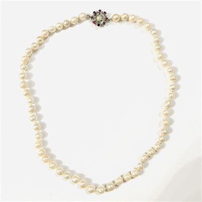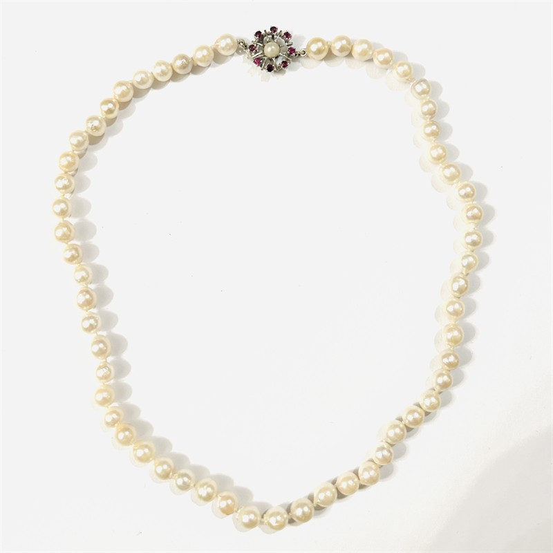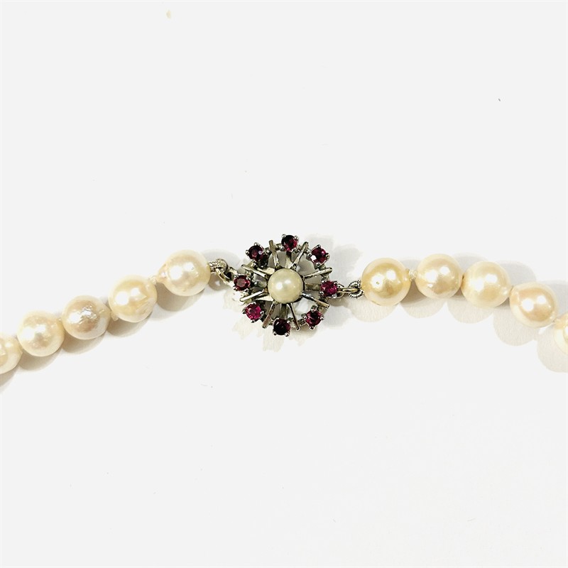 Tradiční náhrdelník se šňůry přírodních kultivovaných smetanově bílých perel, jež vynikají svou přirozenou nepravidelností a průměrem okolo 7 mm. Kulaté zapínání s žebrovou konstrukcí osazeno 8 přírodními rubíny kulatého brusu, ve středu osazeno přírodní kultivovanou smetanově bílou perlou (půlperla). Vhodné k dennímu nošení i večerní příležitosti, německá práce ze 3. čtvrtiny 20. století. Koncové kroužky z bílého 14 karátového zlata, tj. o ryzosti 585/1000, zapínání z nezlaceného stříbra o ryzosti 835/1000; ryzostní číslo zespod zapínání. Hmotnost 27,26 g, délka 44,5 cm, průměr zapínání 15 mm. Nově převlečeno, perly jsou mezi sebou pečlivě uzlíkovány. Zapínání v pořádku, celkově v zachovalém stavu.