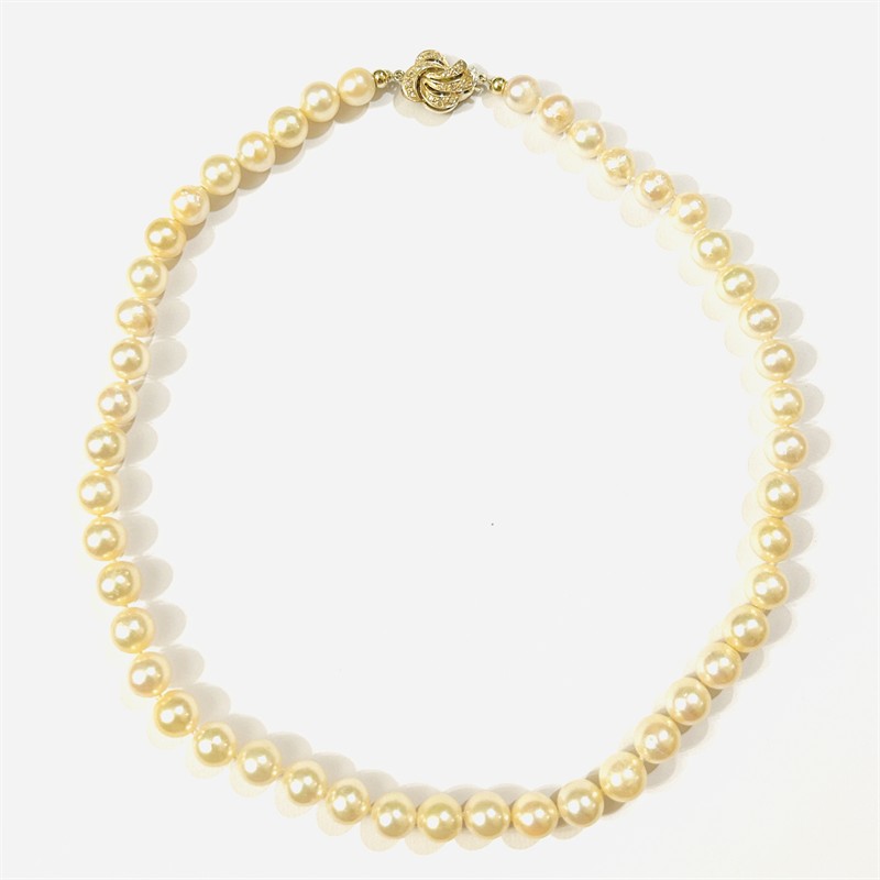 Výrazný náhrdelník se šňůry přírodních kultivovaných smetanově bílých mořských perel, které vynikají svou mírnou organickou asymterií, leskem a větším průměrem 8-9 mm. Zapínání ve tvaru stylizovaného prořezávaného pletence, oboustranně osazeno přírodními diamanty kulatého jednoduchého brusu o celkové cca váze 0,54 ct (0,015 ct - 36 ks). Vkusný, tradiční šperk vhodný k dennímu nošení i večerní příležitosti, západoevropská práce z 50. až 80. let 20. století. Zapínání zhotoveno ze žlutého 14 karátového zlata, tj. o ryzosti 585/1000; nově opatřeno puncem Z-58 (labuť 4), ryzostní číslo a značka výrobce na zapínacím háčku. Hmotnost 45,06 g, délka 44,5 cm, délka zapínání 19 mm, šířka 13,5 mm. Nově převlečeno, perly jsou mezi sebou pečlivě uzlíkovány. Zapínání v pořádku, celkově ve velmi zachovalém stavu.