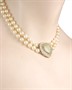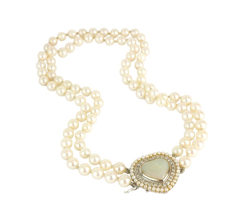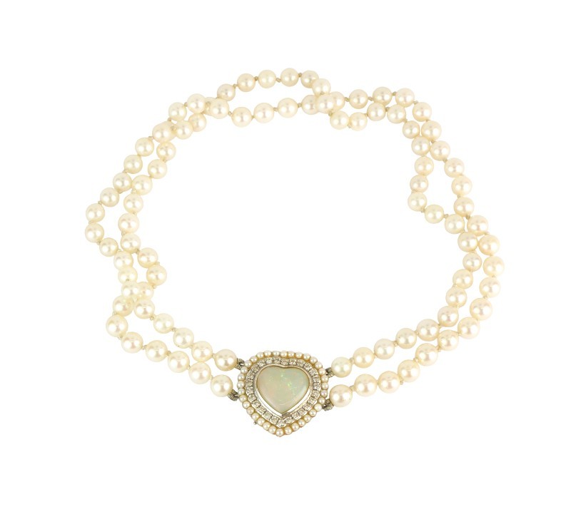 Reprezentativní, luxusní náhrdelník ze dvou šňůr přírodních kultivovaných mořských narůžovělých bílých perel (pravděpodobně typu Akoya), průměrem 5,8 až 6,4 mm a vynikající kvalitou. Důmyslně schované zapínání v podobě srdce osazeno muglí stejného tvaru z přírodního modro-zeleného opálu o váze 3,60 ct, původem pravděpodobně z Austrálie, rámováno přírodními diamanty kulatého briliantového brusu o celkové váze 044 ct (0,016 ct - 24 ks), jež jsou velmi dobré kvality, okraj osazen přírodními kultivovanými bílými perlami o průměru 2 mm a vynikající kvality. Precizní, patrně západoevropská klenotnická práce z poslední třetiny 20. století. Zapínání zhotoveno z bílého 18 karátového zlata, tj. o ryzosti 750/1000; nově opatřeno puncem Z-35 (kohout 3) zespoda. Hmotnost 40,10 g, celková délka 36 cm, délka zapínání 24 mm, šířka 25 mm. Patkové zapínání včetně "8" pojistky v pořádku, perly jsou mezi sebou pečlivě uzlíkovány, celkově ve velmi zachovalém stavu. Součástí odborný posudek.