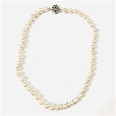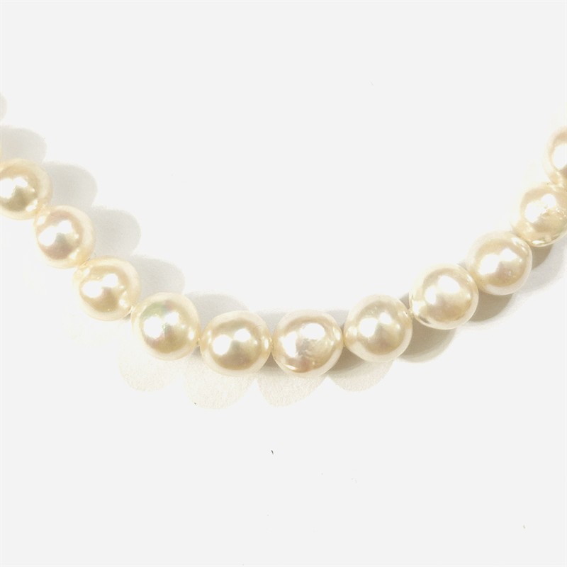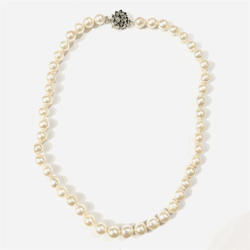 Výrazný náhrdelník se šňůry přírodních kultivovaných mořských Akoya bílých perel, které vynikají svou organickou asymteričností, vysokým leskem a větším průměrem okolo 8 mm. Kulaté zapínání v podobě točitého květu osazeno 9 přírodními modrými safíry kulatého brusu. Vkusný, tradiční šperk vhodný k dennímu nošení i večerní příležitosti, západoevropská práce z 60. až 80. let 20. století. Zapínání zhotoveno z bílého a žlutého 14 karátového zlata, tj. o ryzosti 585/1000; nově opatřeno puncem Z-58 (labuť 4) zespod, ryzostní číslo též a na zapínacím háčku. Hmotnost 40,24 g, délka 44 cm, průměr zapínání 13 mm. Nově převlečeno, perly jsou mezi sebou pečlivě uzlíkovány. Zapínání v pořádku, celkově ve velmi zachovalém stavu.