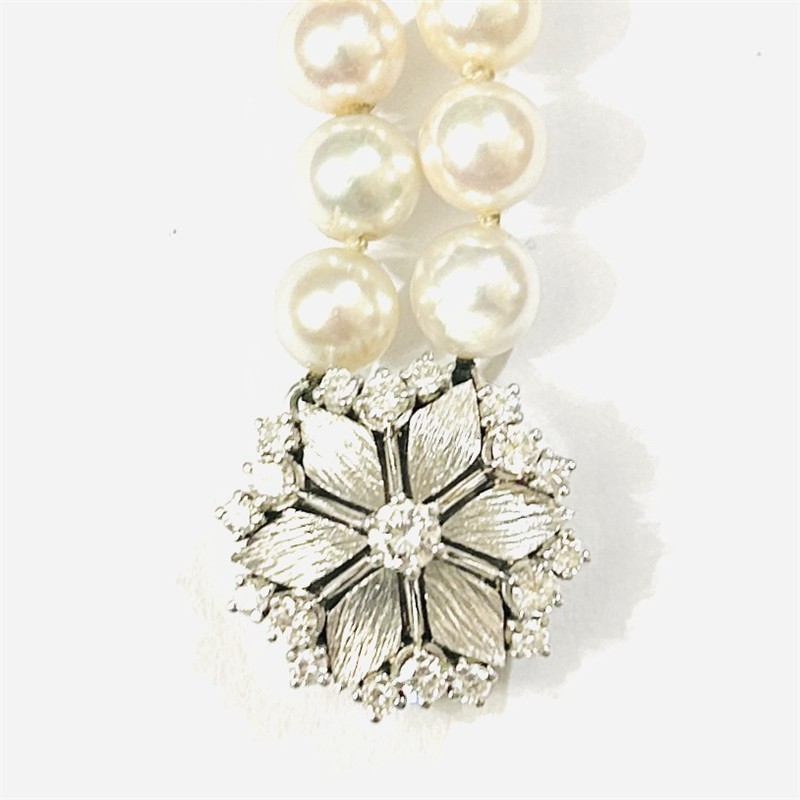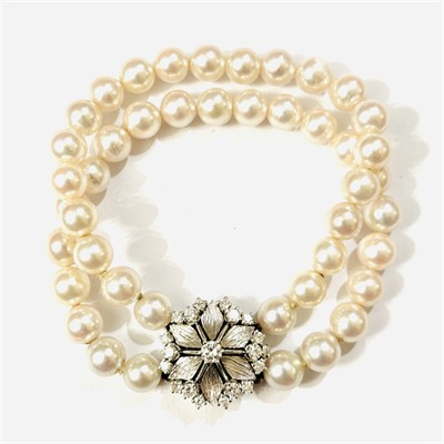 Reprezentativní, luxusní náramek ze dvou šňůr přírodních kultivovaných mořských narůžovělých bílých perel, jež vynikají průměrem od 6 až 7 mm, téměř dokonalou kulatostí a vysokým leskem. Zapínání v podobě stylizovaného kulatého květu, zušlechtěno organickým rytím lístků a osazeno přírodními diamanty kulatého briliantového brusu o celkové váze cca 0,86 ct (0,20 ct - 1 ks; 0,05 ct - 6 ks; 0,03 ct - 12 ks), jejich kvalita je velmi dobrá. Precizní německá klenotnická práce, patrně z dílny gmündského zlatníka Josefa Pausera ze 70. let 20. století. Zapínání zhotoveno z bílého 14 karátového zlata, tj. o ryzosti 585/1000; nově opatřeno puncem Z-58 (labuť 4), ryzostní číslo a značka výrobce "JP" zespoda. Hmotnost btto 24,95 g, délka 17 cm, průměr zapínání 18,5 mm. Patkové zapínání v pořádku, uzlíkovány vždy pouze 2 poslední perly, celkově ve velmi zachovalém stavu.
