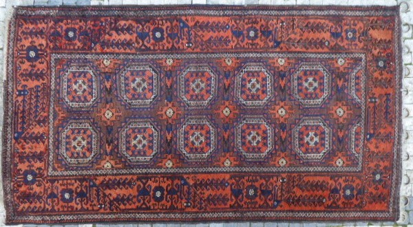 Ručně vázaný vlněný koberec. Koberec vyráběný kočovnými kmeny Belučů při hranicích Íránu, Pakistánu a Afghanistánu v oblasti Balúčistánu (Belúdžistán) zvaný též Belutch. Je podšitý látkou se závěsnými mosaznými kroužky. Persie, Írán 1930 - 1940. Rozměr 180 cm x 100 cm.
