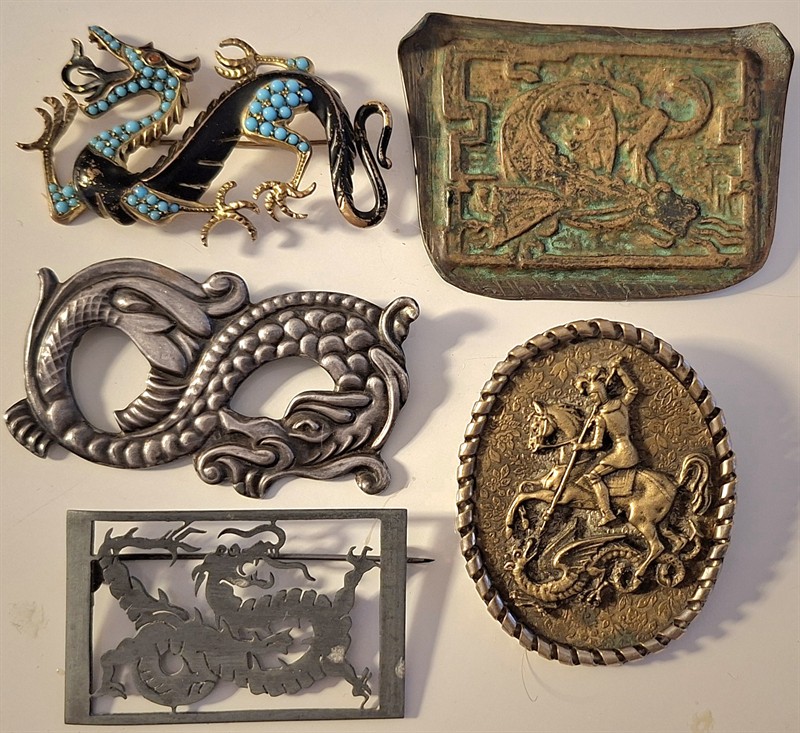 Drak ze žlutého kovu s černým smaltem vykládaný modrozelenými kaménky imitujícími tyrkys, tombak , sklo, 20. léta m.s. art deco, rozměr 6,5 x 4 cm, hmotnost 19 g, Vodní drak v japonském stylu, kombinovaná brož - tepaný stříbrný plech s jádrem z obeckého kovu, Turnovsko, značeno, 20. léta m.s. art deco, rozměr 3,8 x 6,5, hmotnost 20 g, Létající drak v čínském stylu, žlutý patinovaný kov, 20. léta m.s. art deco, rozměr 6 x 7,5 cm, hmotnost 24 g Svatý Jiří bojující s drakem, brož v barokním stylu, žlutý a bílý obecný kov, rozměr 6,5 x 5 cm, hmotnost 29 g, Čínský drak, art deco, bílý patinovaný kov, řezba z destičky bílého kovu, (nepuncováno), 20. léta m.s,, , 5,5 x 3,5 cm, hmotnost 9g