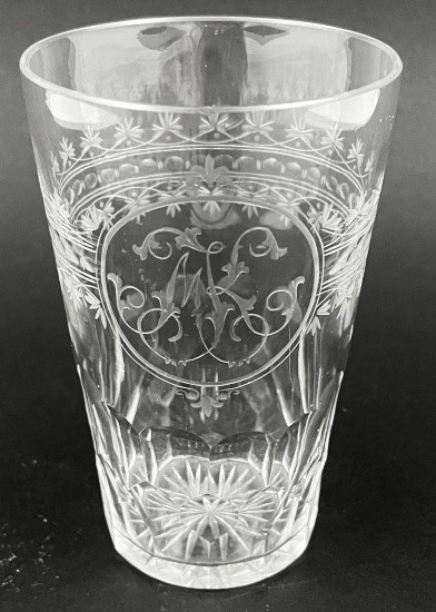 Čiré ručně broušené a ryté sklo. Pět elegantních ručně broušených a rytých skleniček z čirého skla. V medailonu ručně vyrytá písmena doplněná po obvodu skleniček broušenými čočkami a rytými florálními motivy. Na dně ručně broušená hvězdice. Střední Evropa 1870 - 1900. Výška 13 cm.
