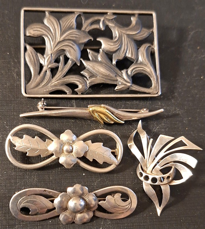 1. Velká tepaná stříbrná brož - zvonky, hmotnost 13,5 g, rozměr 6,2 x 4 cm, stříbro 875/1000, 20. léta m.s. art deco 2. Stříbrná brož – květina I. , mistrovská značka M.D v obdelníku, stříbro 900/1000, čs. punc (dodatečně puncováno), 20. léta m.s., rozměr 5 x 3 cm, 5g 3. Stříbrná brož květina II, mistrovská značka F.P, v kruhu, puncováno dvojkříž 3, stříbro 900/1000, 20. léta m.s., rozměr 5 x 1,9 cm, hmotnost 7 g 4. Stříbrná brož se zlaceným květem, stříbro 925/1000, puncováno, rozměr 6,5 x 1 cm, hmotnost 4,9g 5. Stříbrný květ stříbro 900/1000, nově puncováno, 20. léta mm.s., rozměr 4,5 x 2,5, hmotnost 4 g