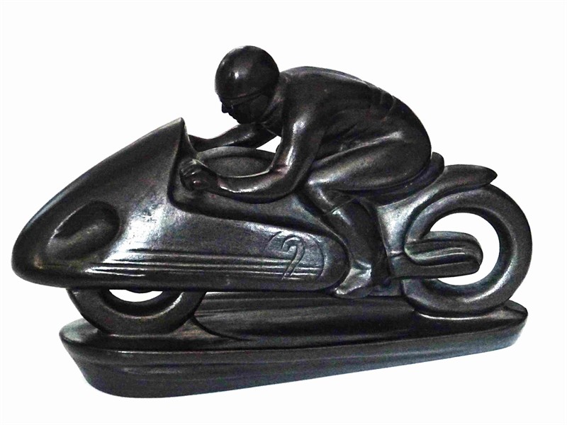 keramická soška motorkáře, patina tmavě-bronzová, délka 20 cm