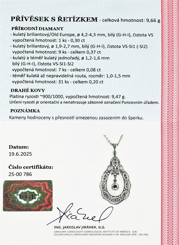 Platina o ryzosti 850/1000 váha celkem 9,65 g přírodní diamant Old Europe 1 ks 0,30 ct, bílý (G-H-I), čistota VS přírodní diamanty 9 ks 0,37 ct, bílý (G-H-I), čistota VS-SI1 (-SI2) téměř kulatá až nepravidelné routy 31 ks - 0,20 ct výška přívěsku 3,9 cm délka řetízku 45 cm výborný stav osvědčení puncovního úřadu certifikát z gemologické laboratoře je součástí šperku