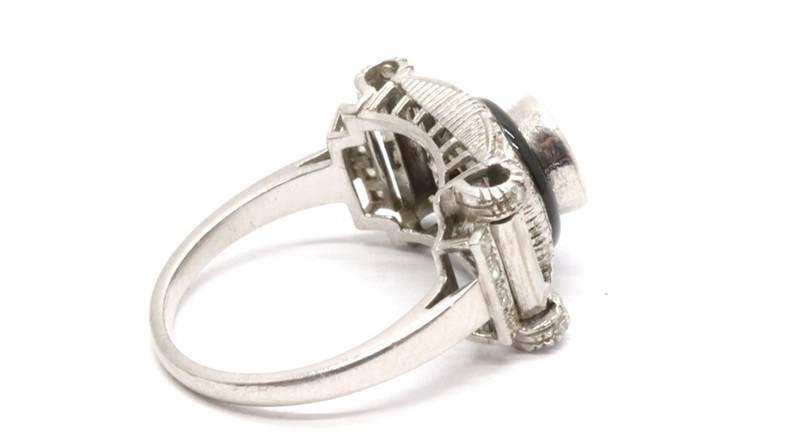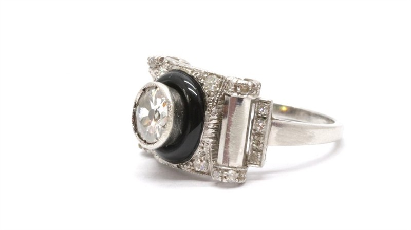 Platinový prsten s diamanty a onyxem Art Deco. Platina 950/1000, bílé zlato 750/1000, centrální diamant zasazen ve stříbře 870/1000. Přírodní onyx. Přírodní diamanty - starý brus, kvalita SI2 - I1, barva H - J, celková váha 0,93 ct (centrální diamant 0,69 ct, I1, I - J). Váha prstenu: 7,19 g. Velikost prstenu: 54. Osvědčení puncovního úřadu. K prstenu je vypracován znalecký posudek.