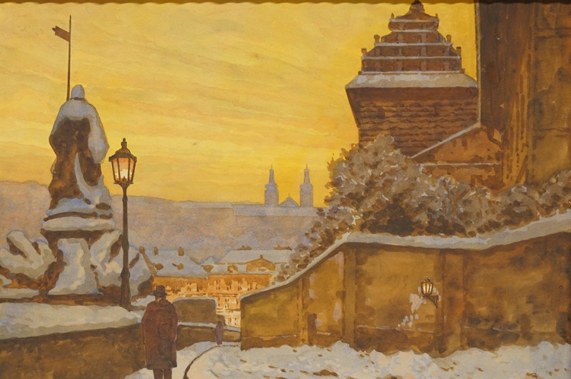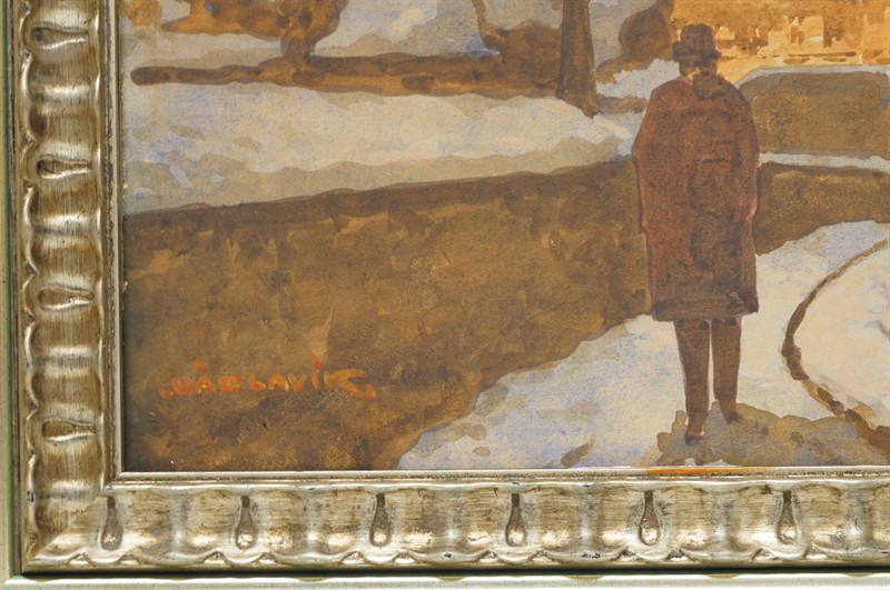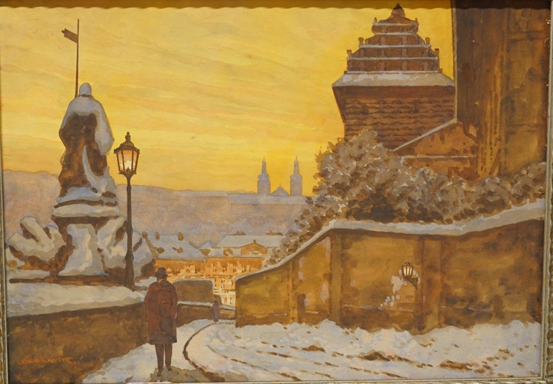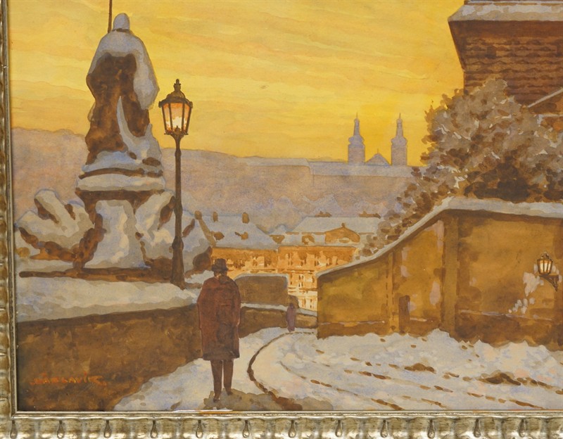 Pražský zimní námět v podvečer - větší práce, tempera na malířské lepence od oblíbeného autora pražských vedut, malíře - Rudolf VÁCLAVÍK (*1898). Tvořil v první polovině minulého století a převážně zobrazoval historická pražská zákoutí. Adjustováno v krásném masivním rámu pod sklem, sign. l.d. Dobrý stav, celkový rozměr - 85 x 65cm, rozměr díla - 70 x 50cm