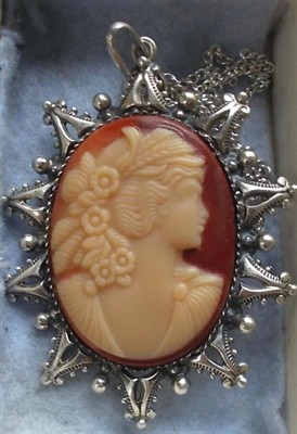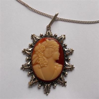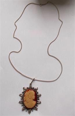Přívěšek s kamejí i s řetízkem je stříbro 900/1000 puncované platným českým puncem z období I. republiky. Přívěšek i s řetízkem váží celkem 16,90 gramů. Délka řetízku je 55 cm, průměr kameje na výšku je 5 cm, délka na výšku s poutkem 6,5 cm. Vše je v pěkném stavu, nepoškozené.