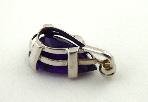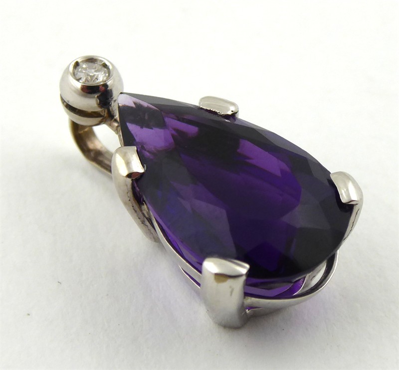 Osmnáctikarátové bílé zlato, přírodní ručně broušený velký ametyst, přírodní ručně broušený malý diamant. Ryzost Au 750/1000, celková hmotnost 3,9 g. Přívěsek z osmnáctikarátového bílého zlata s centrálním přírodním ametystem uprostřed ve tvaru kapky s oboustranným výbrusem doplněným v horní části přírodním diamantem o váze 0,05 ct, barva H, čistota SI. Značeno: československý punc kohout, ryzost 750, mistrovská značka. Itálie, třetí třetina minulého století. Rozměr přívěsku výška 20 mm, šířka 12 mm.