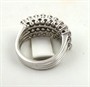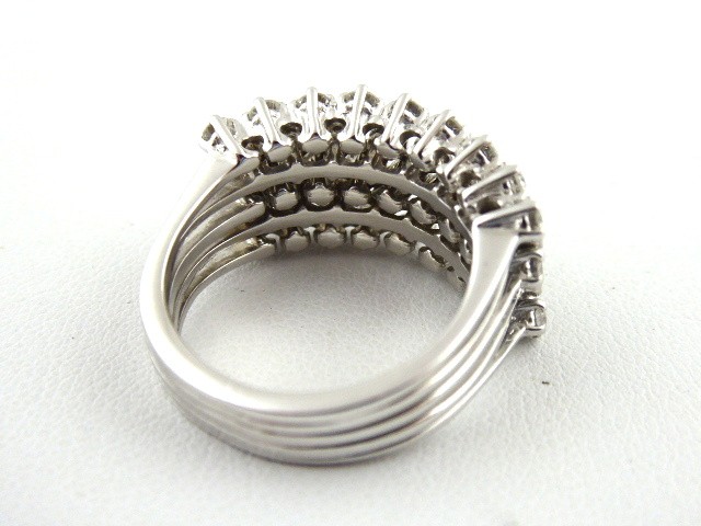 Bílé 18 karátové zlato, přírodní broušené diamanty. Ryzost Au 750/1000, celková hmotnost 9,50 gramů. Třiačtyřicet přírodních diamantů moderního briliantového brusu o váze 1,05 ct, barva H, čistota Si. Obroučka prstenu z bílého 18 karátového zlata tvořená pěti drátky navzájem dole spojenými. Hlava prstenu osázená dvěmi řadami s kulatými 16 přírodními diamanty moderního briliantového brusu o váze 0,25 ct a třemi řadami s 27 osazenými přírodními diamanty moderního briliantového brusu o váze 0,80 ct. Designový prsten. Značeno: nezřetelná mistrovská značka, československý punc hlava kohouta s číslem 3. Evropa, druhá polovina minulého století. Velikost prstenu 53.