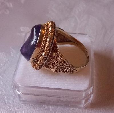 Prsten s ametystem je puncovaný platným českým puncem pro cizí zboží platným od roku 1921. Prsten je stříbro 925/1000 silně zlacené. Váha prstenu je 10,40 gramů a velikost prstenu je 57. Velikost prstenu je variabilní, lze jej roztáhnout do větší velikosti nebo naopak zmenšit. Průměr koruny prstenu je 2,5 cm na délku a 2 cm na šířku. V koruně prstenu je velký ametyst, který není vybroušený, ale je zasazený v přírodním stavu. Je to krásná šperkařská práce.