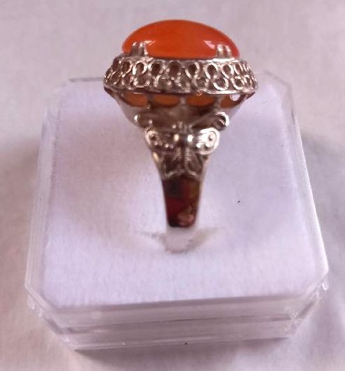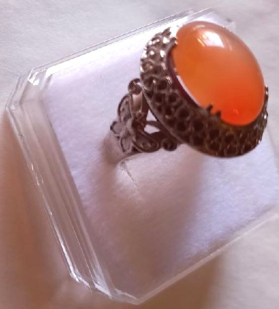 Prsten s karneolem je překrásně šperkařsky zpracovaný. Po stranách obroučky u koruny prstenu jsou malí motýlci. Prsten je puncovaný platným českým puncem pro stříbro 900/1000 dovozovou značkou. Váha prstenu je 7,80 gramů. Velikost prstenu je variabilní, obroučka není spojená, takže ji lze nastavit podle potřeby.Průměr karneolu v koruně prstenu je 1,5 cm. Průměr celé koruny je 2 cm.