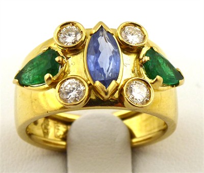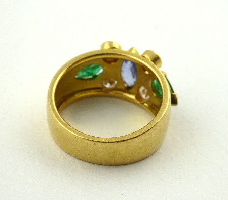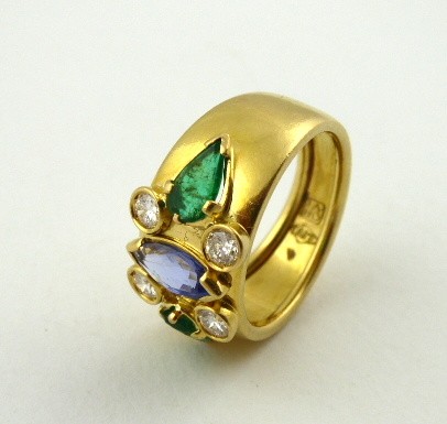 Osmnáctikarátové žluté zlato, přírodní smaragdy, přírodní safír a přírodní diamanty o celkové váze 0,45 ct. Ryzost Au 750/1000, celková hmotnost 6,93 g. Krásný designový prsten italské provenience se čtyřmi přírodními diamanty moderního briliantového brusu o celkové váze 0,45 ct, barva G, čistota SI2, dvěma přírodními smaragdy a jedním přírodním safírem. Prsten z osmnáctikarátového zlata s centrálním přírodním modrým safírem ručně broušeným do tvaru markýz, jehož po stranách doplňují dva přírodní zelené smaragdy výbrusu pendlok, okolo doplněné čtveřicí přírodních diamantů kulatého briliantového tvaru. Prsten se nalézá ve vynikajícím stavu. Značeno: československý punc kohout, ryzost 750 a značka klenotnického mistra. Itálie, třetí třetina minulého století. Velikost prstenu 54.