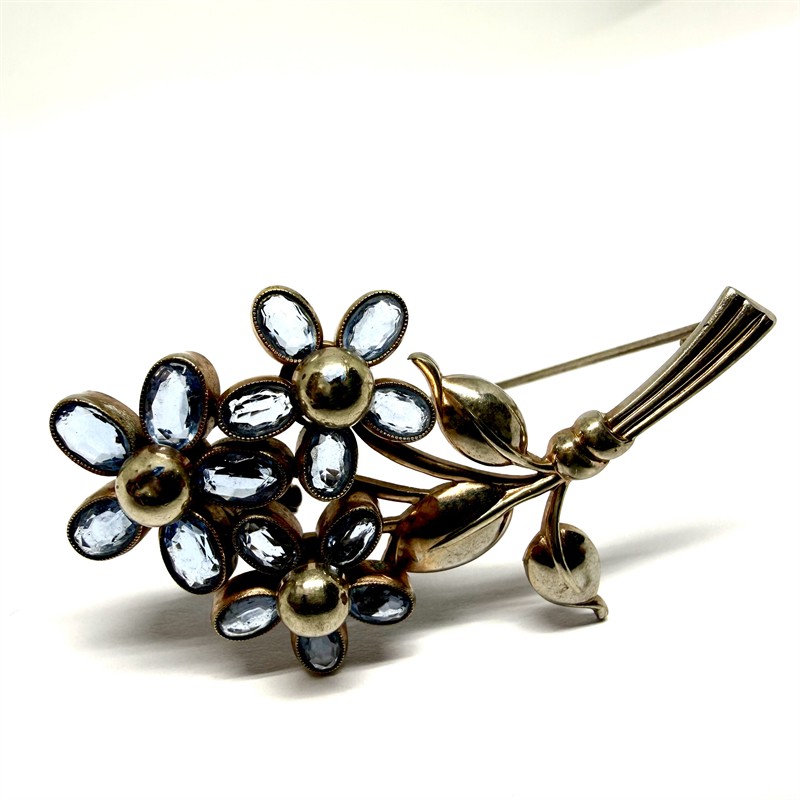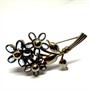 Malebná brož znázornující kytici se třemi květy. Šperk zdobí ocelově modré kameny na místě okvětních lístků. Obecný kov. Rozměry cca 5 x 2,ř cm. Pojistka zapínání. Výborný stav.