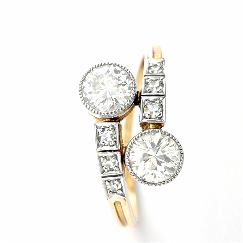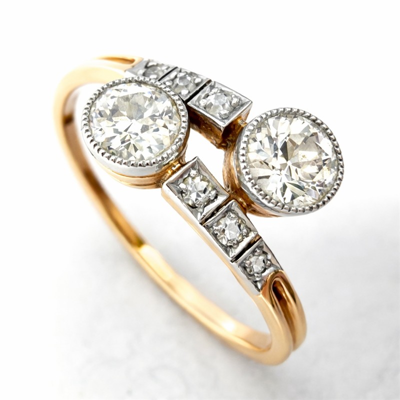 Velmi půvabný, zlatý prsten zdobený brilianty z období první republiky. Šperk byl zhotoven ze zlata ryzosti 14 karátů (585/1000), o celkové váze 1,91 g. Nadčasový design zdobí dva větší brilianty starého brusu o celkové váze cca 0,40 ct a šest drobných diamantů. Velikost 59,5. Změna velikosti prstenu v ceně. Výborný stav.