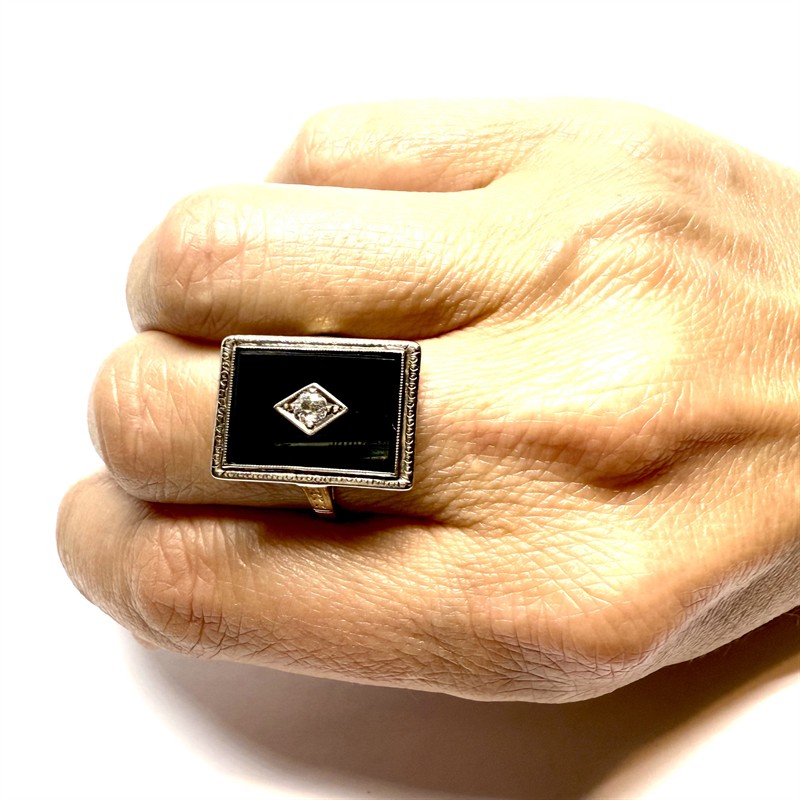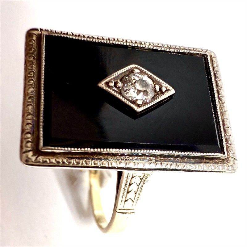Výrazný, nadčasový prvorepublikový prsten. Šperk byl vyroben ze 14ti karátového zlata (585/1000) a zdobí jej onyxová destička na středu osazená diamantem starého brusu. Celkový dojem umocňuje jemně, intenzivně rytím zdobený zlatý rámeček. Rozměry 1,9 x 1,3 cm. Celková váha šperku 4,45 g. Velikost 57. Profesionálně vyčištěno, perfektní stav.