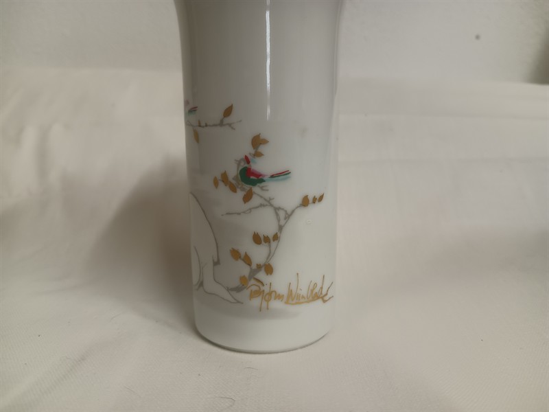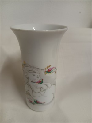 Váza z bílého porcelánu , Rosenthal ,s motivem odpočívající ženy , s ptáčky . Signováno Björn Wiinblad . Výška 12 cm .