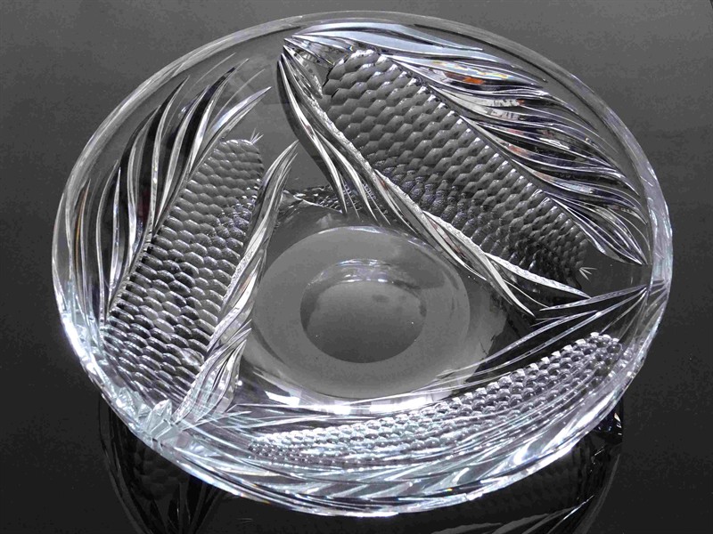 broušená mísa s motivem kukuřice zhotovený podle návrhu Miluše Roubíčkové, průměr cca 30 cm, 60. - 70. léta
