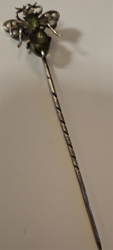 Moucha - rozměr 19 mm x 11 mm, 2 olivíny, 6 kusů sladkovodních perliček, na nožičce mistrovská značka RL, celková délka jehlice 7,5 cm, hmotnost 2,12 g, stříbro 835/1000 (nově puncováno na jehle viz. Boleta PÚ), Rudolf E. Langer (1847-1915) zakladatel a majitel významného zlatnického, stříbrnického a bižuterního závodu historismu a secese v Lanškrouně („Gold Silberwaaren Fabrik R. E. Langer“ zal. 1877). Velmi brzo začal své velmi kvalitní výrobky exportoval do zahraničí. Na přelomu let 1888-1889 otevřel firemní obchod ve Vídni. Úspěšný byl i na světové výstavě v Chicagu (1893). Langer brzy získal titul dvorního dodavatele a těšil se přízni členů habsburského domu včetně samotného císaře Františka Josefa I. Císař dokonce navštívil v roce 1894 Langerovu továrnu v Lanškrouně (jako dar obdržel psací soupravu ze stříbra, osázenou perlami, safíry a rubíny). Po smrti RL a dědických sporech došlo k úpadku firmy, kterou se po roce 1918 nepodařilo obnovit.
