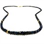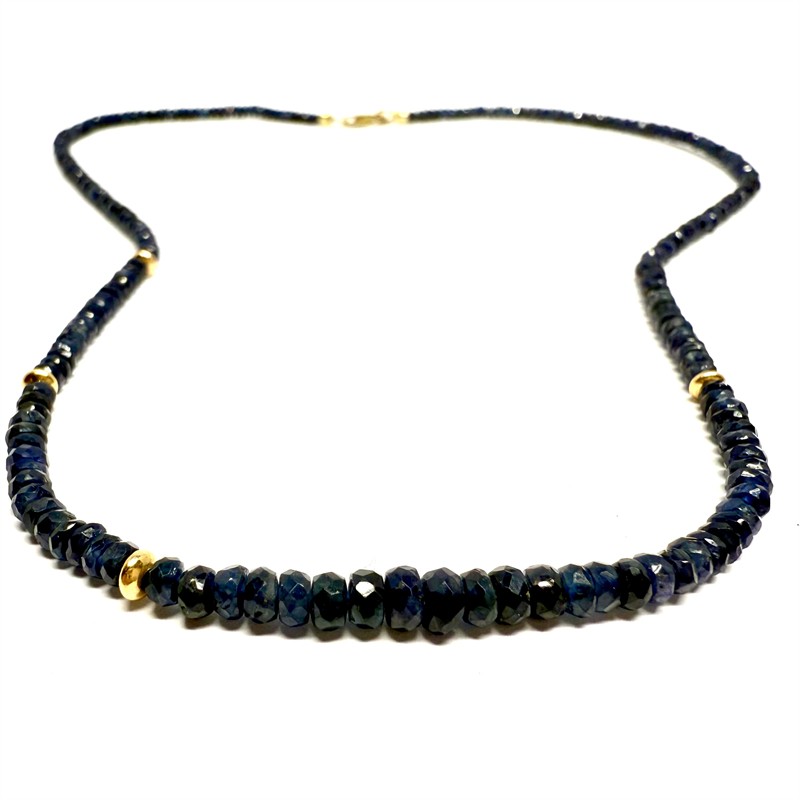 Elegantní safírový náhrdelník zdobený zlatými komponenty. Šperk byl zhotoven z mnoha desítek modrých safíru o průměru 2 - 4 mm. Zapínání a asymetricky rozmístěné zlaté zdobení vyrobeno ze zlata ryzosti 585/1000. Váha 10,67 g. Délka šperku 46 cm .Výborný stav.