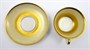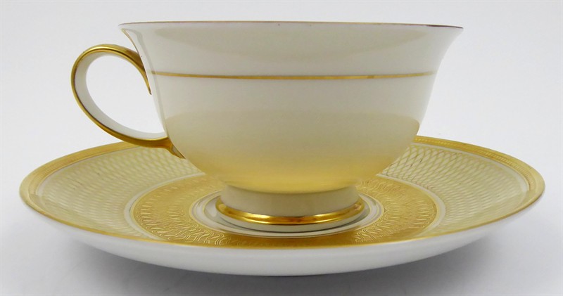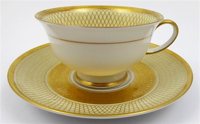 Slonovinový, bílý a zlacený porcelán. Porcelánka Rosenthal. Název vzoru: Aida. Porcelánový šálek s podšálkem slonovinové barevnosti dekorovaný motivem zlacené mřížky a silně zlacenými ornamentálními pásy. Značeno zespodu: Rosenthal, Selb-Plössberg, Bavaria-Germany, Aida a značka malíře. Německo, Selb-Plössberg, 50. léta minulého století. Výška šálku 6 cm, průměr podšálku 15,5 cm.