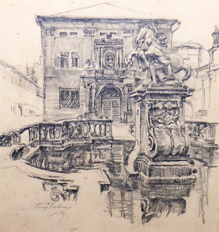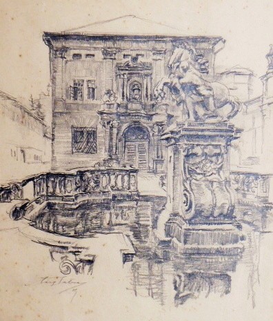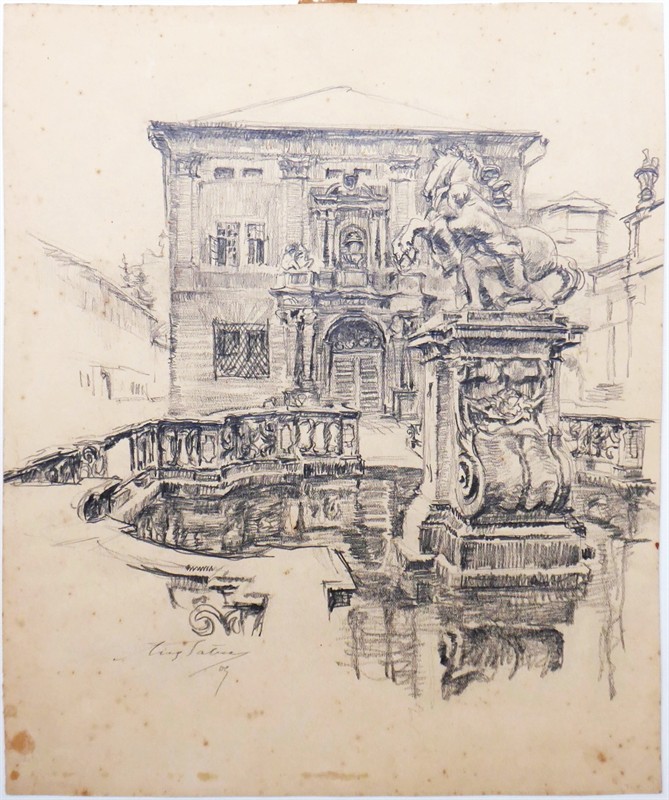 Rakousko-Uhersko, Salzburg, rok 1904. Kresba tužkou na papíru 27 cm x 22 cm. Signováno tužkou vlevo dole s datací 1904. Autor: Augustin Satra (1877-1909). Nerámováno. Z umělecké sbírky Ladislava Šalouna.