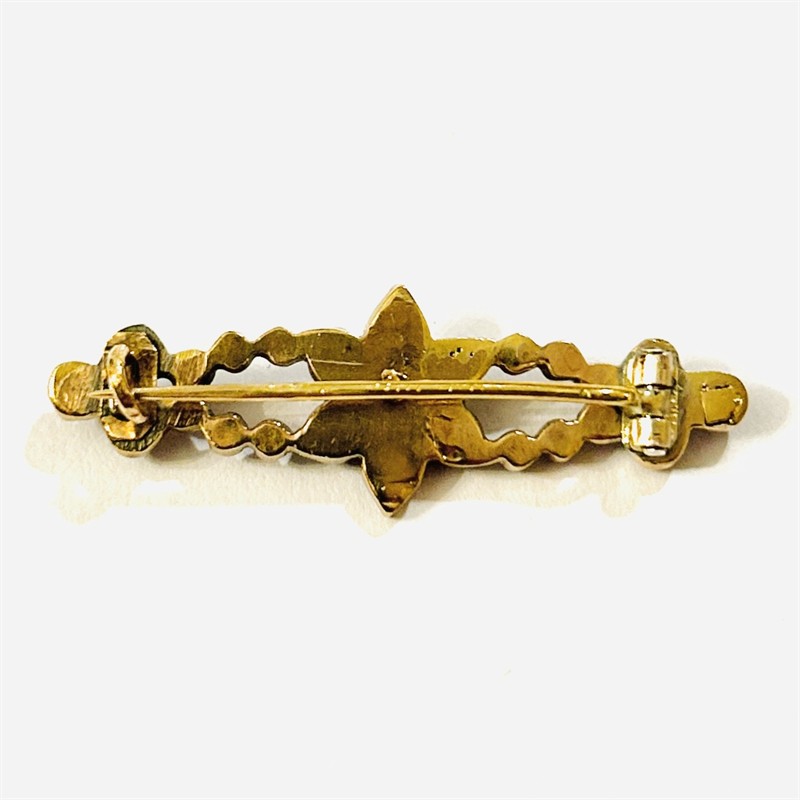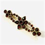 Elegantní brož z období secese, podlouhlé tělo s centrálním motivem květu, ramena s průhledy zakončeny trojlistem, osazeno českými granáty kulatého a kapkového brusu, fasováno v zrnitých obrubách. Precizní tuzemská granátnická práce z počátku 20. století. Zasazeno ve slitině tombaku; neznačeno. Hmotnost 2,24 g, délka 37,5 mm, šířka 12,5 mm. Zapínání na "C" sponu v pořádku, nově přidaná jehla, restaurováno a vyčištěno Monikou Zemanovou, DiS., celkově v zachovalém stavu.