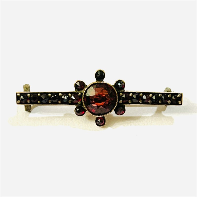 Půvabná brož z období secese, tělo tvořeno linií s centrální nevšední hlavicí připomínajíc květ či Slunce, osazeno větším přírodním almandinem kulatého brusu a českými granáty kulatého routového brusu. Fasováno nýtkovou technikou a obrubami, kvalitní tuzemská granátnická práce z počátku 20. století. Zasazeno ve slitině tombaku; neznačeno. Hmotnost 2,21 g, délka 36 mm, šířka 12,5 mm. Zapínání na "C" sponu v pořádku (v minulosti opravováno), celkově v zachovalém stavu.