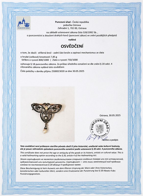zlato o ryzosti 750/1000 stříbro o ryzosti 800/1000 váha 7,85 g výška 3,8 cm, šířka 4 cm přírodní diamanty, perly stříbrná brož - zadní část brože a zapínací mechanismus ze zlata výborný stav osvědčení puncovního úřadu