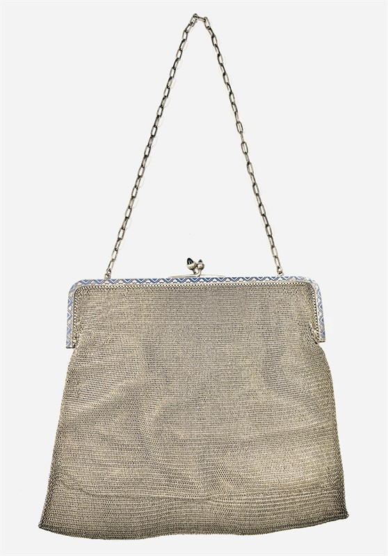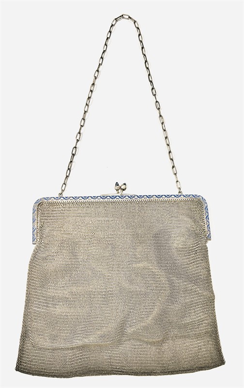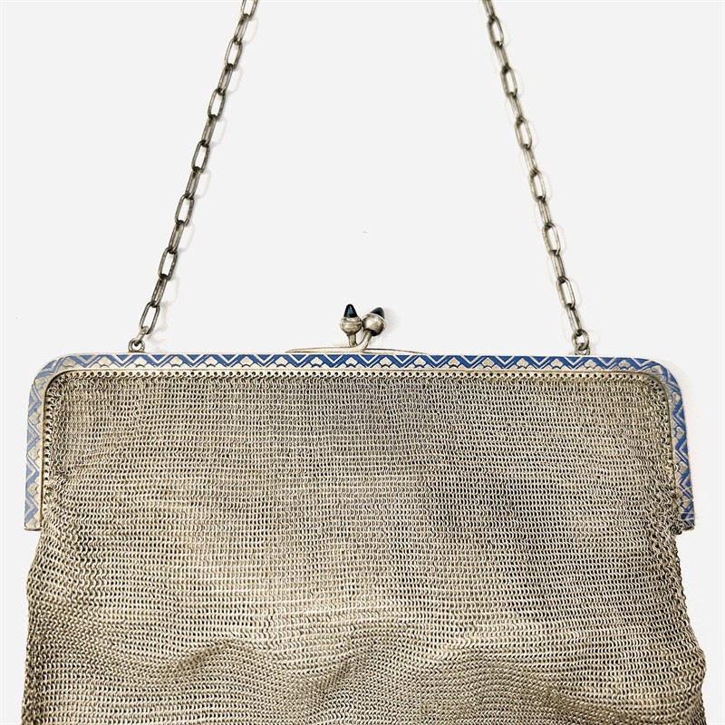 Elegantní dámská kabelka z období secese, tělo z jemných splétaných drátků. Rám zdobený geometrizujícím ornamentem v kontrastním modrém smaltu, který koresponduje s kónickými muglemi syntetických modrých safírů na zapínání, připojen řetízek vazby "anker". Tradičně pojatý kousek, středoevropská či německá práce z první pětiny 20. století. Zhotoveno ze stříbřené alpaky (kvalitní stříbrnická a zlatnická slitina), vnitřek ze světle béžové přírodní kozinky; značka "ALPACCA" zevnitř rámu. Hmotnost 240 g, délka kapsy 17,5 cm, šířka 17 cm, délka řetízku 41 cm, šířka vazby 4 mm. Kuličkové zapínání v pořádku, celkově stopy nošení, při rámu lehce narušena drátěná vazba (nemá vliv na bezpečnost nošení), ponecháno s přirozenou patinou.