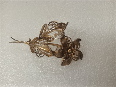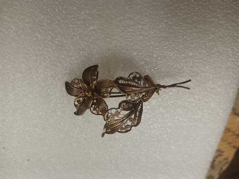 Vetší secesní brož - květina - vyrobena z filigránového stříbra ryzosti 800/1000. Stříbro je zlaceno. Délka 6,5 cm . Hmotnost 6,57 gr. Přiložena boleta Puncovního úřadu