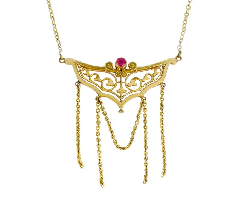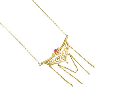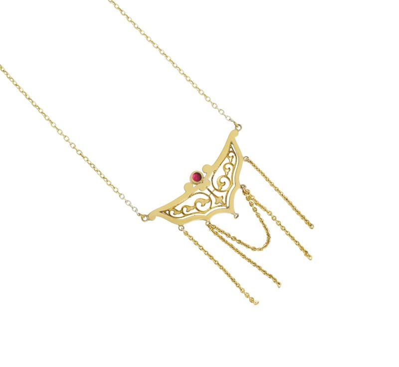 Náhrdelník ze silně zlaceného tombaku zdobený červeným kamenem. Délka náhrdelníku je 64 cm. Rozměry ověsu činí 4,0 x 2,0 cm (visící řetízky jsou dlouhé 3,2 cm). Celková hmotnost 5,92 g.