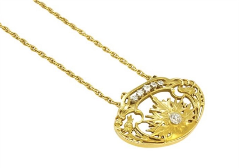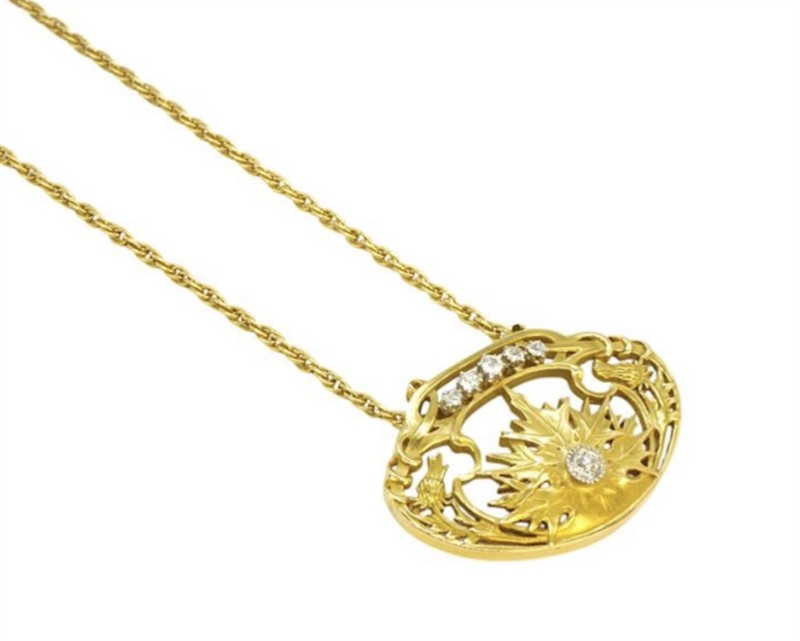 Secesní náhrdelník s brilianty s krásným rostlinným motivem bodláku, je zhotoven ze žlutého zlata - závěs z 18 karátového zlata750/1000 (12,6 g). Brilianty celkové hmotnosti cca 0,40ct., Krásná zlatnická ,pravděpodobně francouzská práce minulého století , Odborně zlatníkem vyčištěno, Osvědčení Puncovního úřadu. Je prodáváno bez řetízku