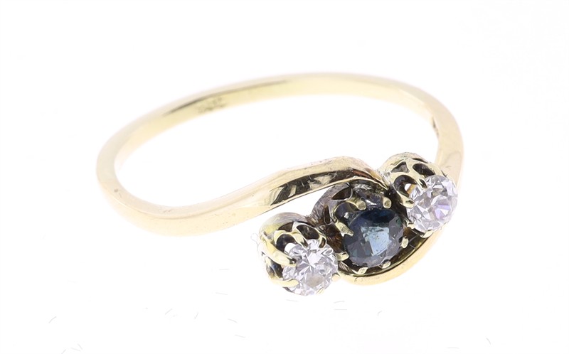 Jemný prsten v secesním stylu, vyrobený ze zlata ryzosti 565/1000, s kameny zasazenými do zlata ryzosti 585/1000. Dominantou prstenu je centrální safír o hmotnosti přibližně 0,10 ct, po jehož stranách jsou zasazeny dva brilianty o celkové hmotnosti přibližně 0,18 ct. Detaily: Materiál: zlato 565/1000 a 585/1000 Kameny: 2 brilianty (celkem cca 0,18 ct) Centrální kámen: safír cca 0,10 ct Celková hmotnost: 2,04 g Velikost prstenu: 53 Styl: secese Osvědčení: vydáno Puncovním úřadem