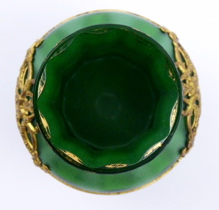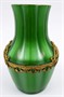 Zelené a bezbarvé sklo, žlutý kov. Období a styl: secese. Světově proslulá sklárna Johann Loetz Witwe, Klášterský Mlýn (Klösterle), založená roku 1836. Luxusní secesní vázička kónického tvaru s reliéfním žebrováním a dekorativní galvanoplastickou montáží. Vázička ze zeleného skla s metalickým stříbrným prachem přejímaná křišťálově bezbarveným sklem. Vázička dekorovaná galvanoplastickou montáží s festony ze žlutého kovu. Čechy, kolem roku 1905. Výška 12 cm.