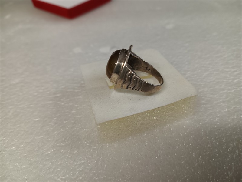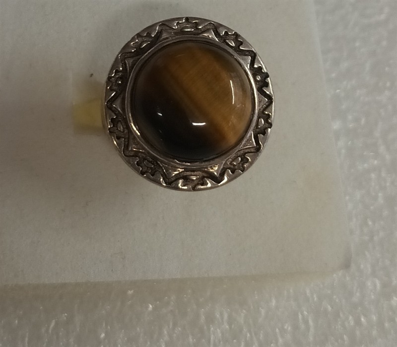 Výrazný prsten vyrobený ze stříbra ryzosti 925/1000, uprostřed s tygřím okem . Hrubá hmotnost 7,10 gr . Velikost prstenu je 56 . Průměr hlavy prstenu je 2 cm .
