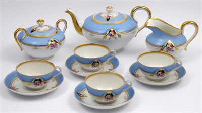 Bílý, barevně ručně malovaný a zlacený porcelán. Porcelánka Doccia Porcelain Manufactory nedaleko italské Florencie založená roku 1720. Nápojová porcelánová souprava složená ze čtyř šálků s podšálky, konvice, konvičky na mléko a cukřenky italské provenience z dílen porcelánové manufaktury Doccia. Souprava zdobená širokými bleděmodrými pásy a ručně zlacenými festony s barevnými kyticemi umístěnými částečně na černém poli. Zlacení místy mírně setřelé a lepený poškozený úchyt u cukřenky. Značeno zespodu: vtlačená hvězdička. Itálie, Doccia 1840 - 1860. Výška šálků 6 cm, průměr podšálků 16 cm, výška konvice 14 cm, výška konvičky na mléko 13 cm a výška cukřenky 13 cm.